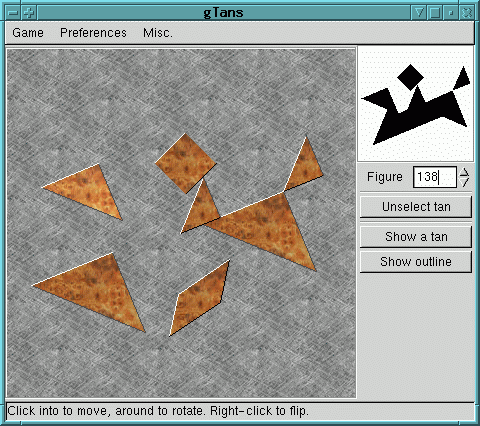 Le Tangram est un puzzle chinois où le joueur doit arranger un ensemble de pièces pour correspondre à une forme donnée. Toutes les pièces doivent être utilisées et ne doivent pas être mises l'une par dessus l'autre. Le jeu de pièces est constitué de 5 triangles, un carré et un parallélogramme. Le jeu gtans fournit 380 figures avec lesquelles jouer. La souris permet de contrôler les pièces. Le jeu est fortement configurable via son interface.