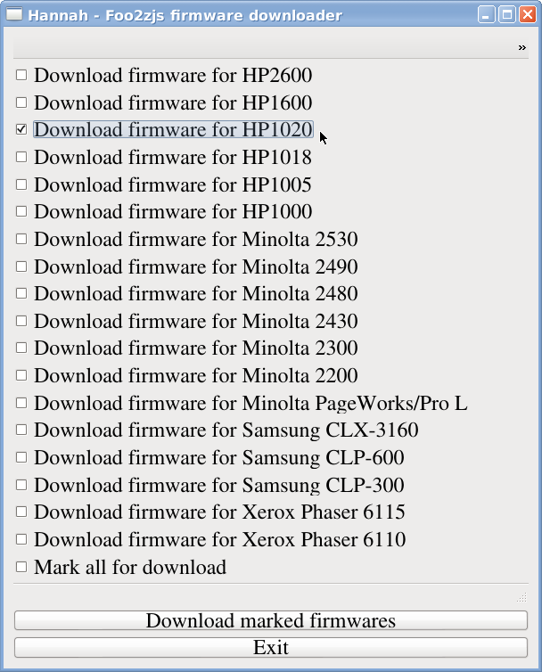 Il vous faudra encore télécharger le micrologiciel propriétaire propre à votre imprimante avec Hannah un logiciel graphique de téléchargement des microprogrammes (« firmware ») pour le paquet foo2zjs.