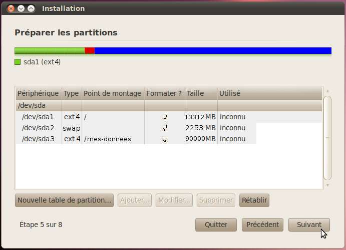 Par exemple, si vous utilisez un live-CD, démarrez votre ordinateur sur celui-ci et commencez l'installation jusqu'à l'étape de partitionnement (intitulée "Préparation de l'espace disque" dans Ubuntu 10.04).