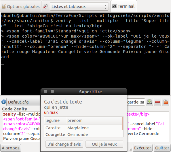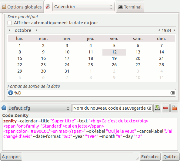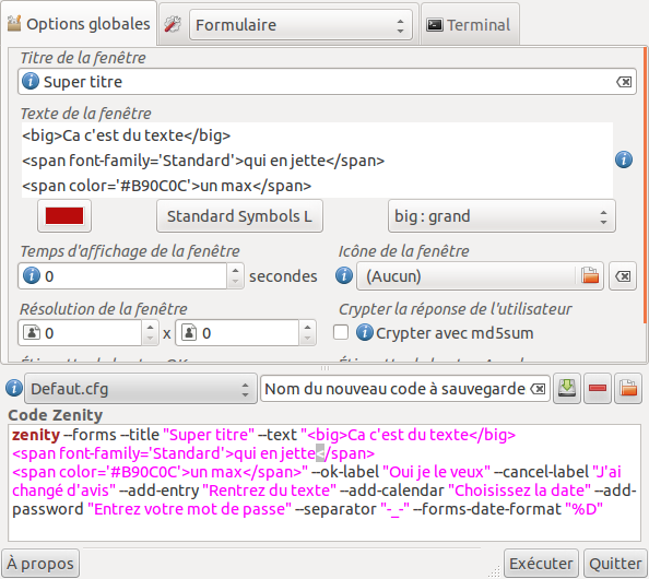 Les options présentes ici sont utilisables sur quasiment tous les types de fenêtre Zenity.