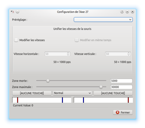 Comme dans le cas des touches simples, il suffit de cliquer sur le bouton correspondant à l’axe à configurer, apparaît alors la fenêtre ci-dessous.