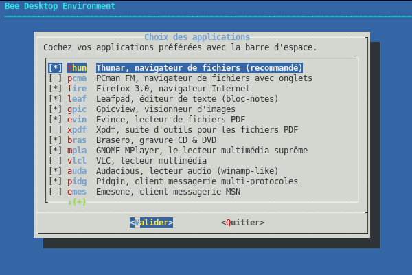 Bee est un script qui permet de composer facilement un environnement de bureau léger avec le gestionnaire de fenêtres Openbox. Il propose le choix du panel, du gestionnaire de connexion réseaux et de la procédure de login (automatique ou avec un display manager). Ensuite on peut choisir les applications à installer dans une liste. Ce script a été conçu pour les PC x86 dont la configuration n'est plus toute jeune. Il existe en plusieurs versions pour Ubuntu et pour Debian.