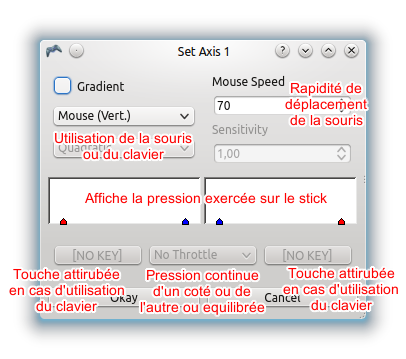 Comme dans le cas des touches simples, il suffit de cliquer sur le bouton correspondant à l'axe à configurer, apparaît alors la fenêtre ci-dessous.
